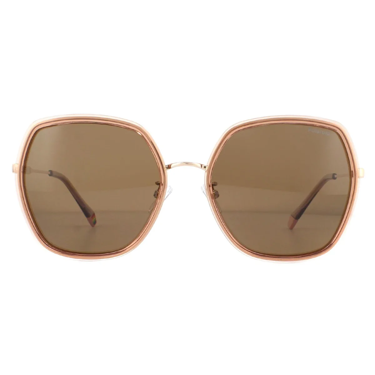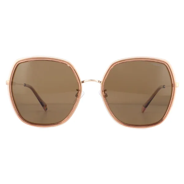 Polaroid zonnebrillen PLD 6153/g/s 35J/SP Pink Bronze Polarisated zijn een oversized elegante stijl met zachte enigszins zeshoekige vormige lenzen. Metalen tempels worden gedrukt met het polaroid -logo en getipt met plastic en de iconische polaroid regenboog.
