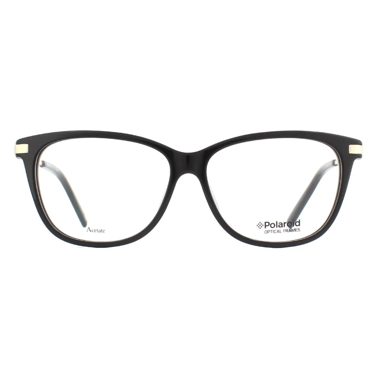 Polaroid Glasses Frames PLD D353 807 Black are a women's frame with a lightweight acetate frame front and metal temples tipped with plastic. Temples feature the brand's logo and the inner tips show the Polaroid Pixel.