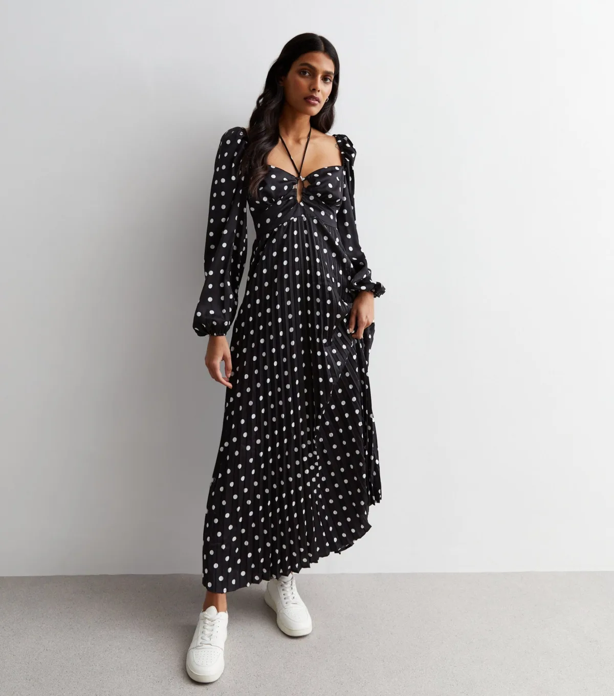 Val op in onze unieke zwarte polkadot geplooide maxi-jurk met uitsnijding. Deze jurk heeft uitsnijdingen aan de voorkant met een gekruiste band, lange mouwen met elastische manchetten en flatterende plooien in de favoriete polka-print aller tijden. Ideaal om te combineren met tijdloze muiltjes en een handtas voor een outfit die klaar is voor een evenement. .