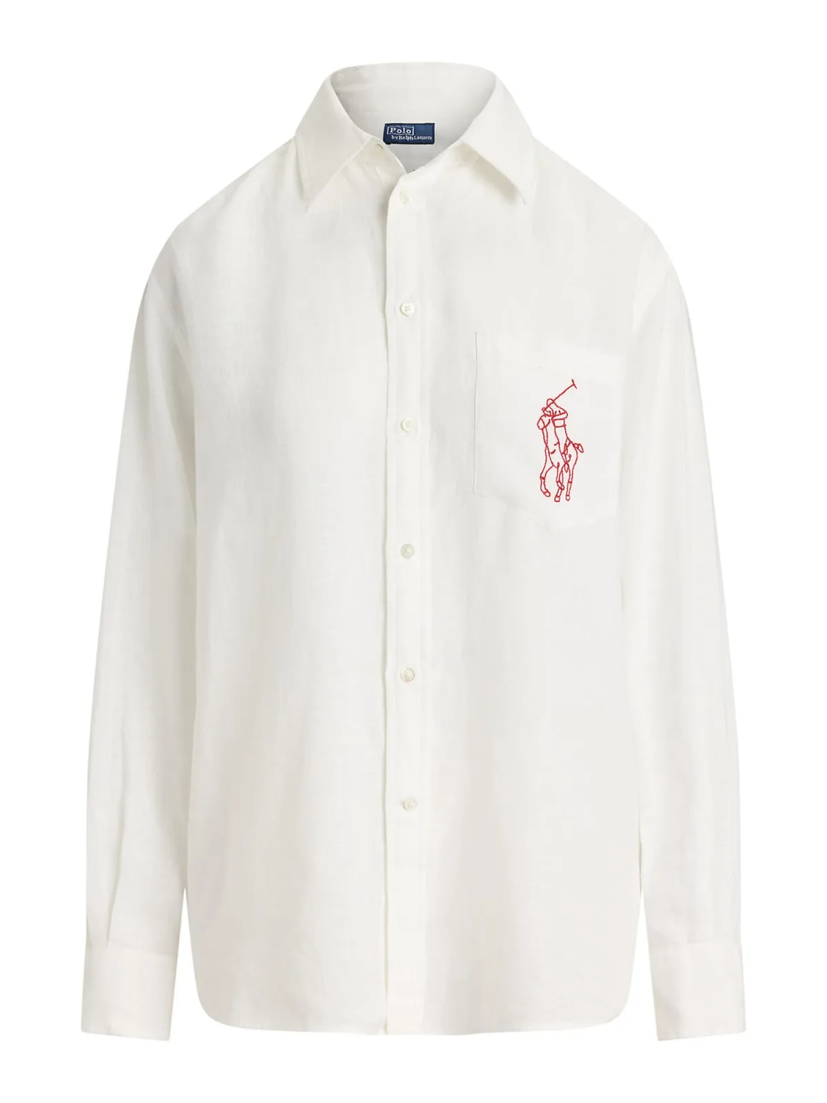 Blouse type: Blouseshirt; Design: 1-knoops manchetten, Gevoerde zoom/rand, Placket, Rugplooi, Borstzak; Type sluiting: Knoopsluiting; Materiaal: Linnen; Motief: Mélange; Kraag: Kentkraag; Details: Borduursels, Plooien; Extra's: Label borduurwerk, Op staal naden, Lichte stof; Pasvorm: Losse pasvorm; Armlengte: Lange mouw; Lengte: Normale lengte