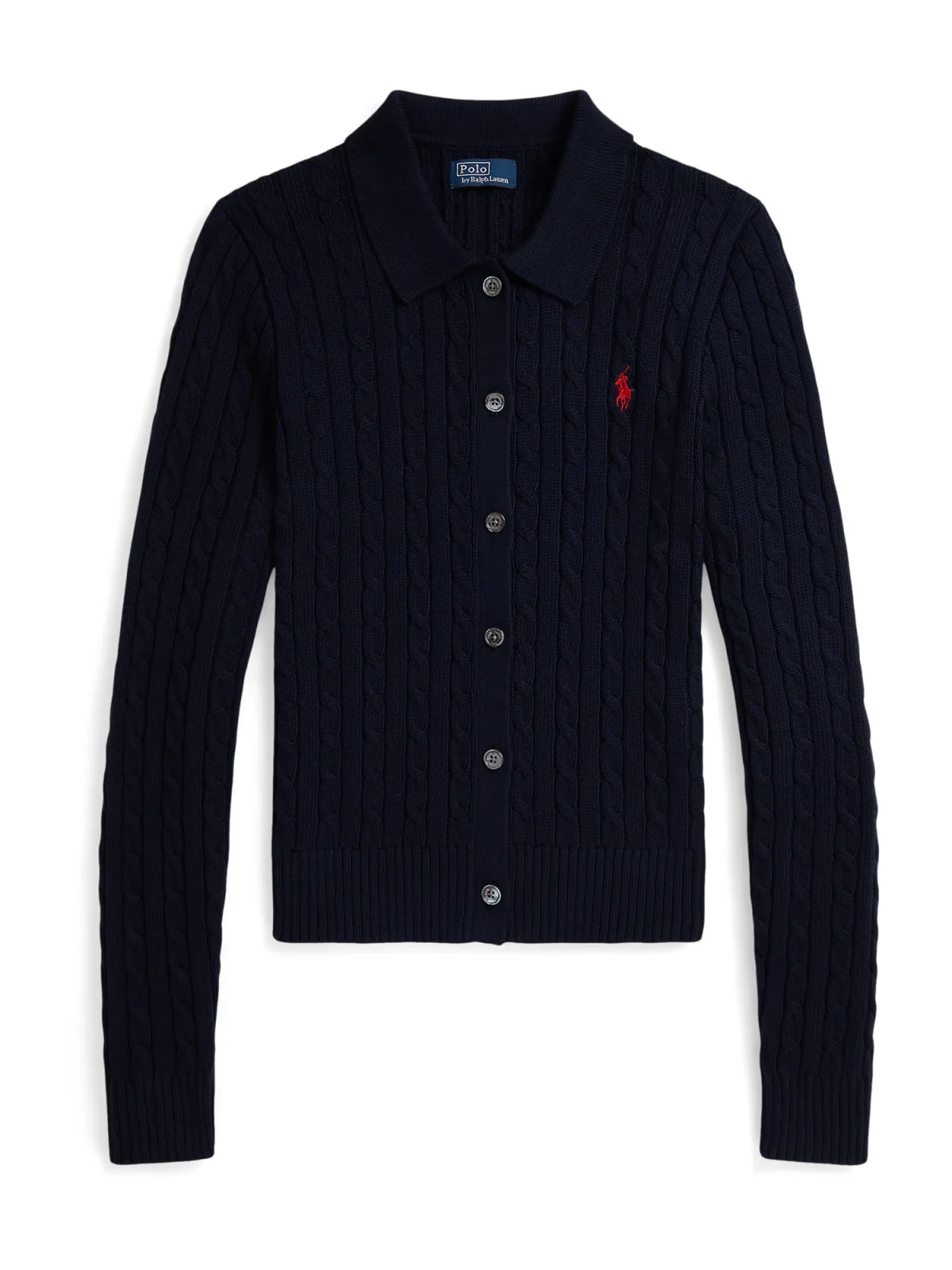 Dames gebreid jack van Polo Ralph Lauren;Look: effen;Pasvorm: Slim fit;Sluiting: enkelvoudige knoopsluiting;Patroon: Kabelpatroon;Applicatie: Gestikt logo;Kraagmodel: Overhemdkraag;Mouwvorm: lange mouw;Mouwboord: geribd;Rompzoom: geribd;Materiaalverwerking: Knitwear;Materiaal: puur katoen