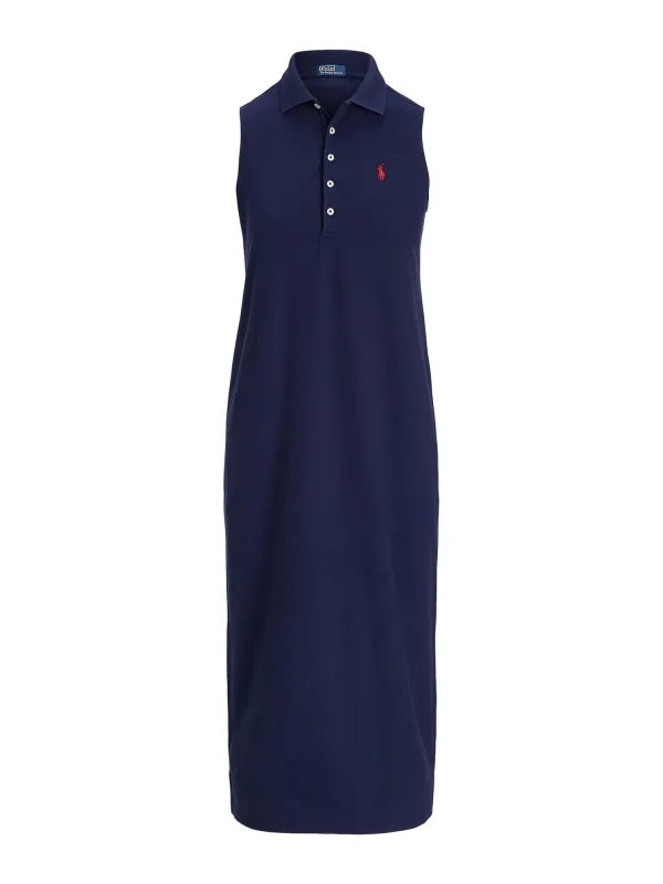 dames polojurk van Polo Ralph Lauren;look: effen;Pasvorm: Flatteus;Lengte: midi;hals: V-hals;Applicatie: gestikt logo;kraagmodel: polokraag;sluiting: korte knoopsluiting;mouwvorm: zonder mouwen;Zoom: recht, zijsplit;materiaalverwerking: piqué;Materiaal: puur katoen