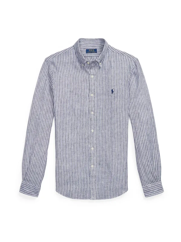 Heren vrijetijdsoverhemd van Polo Ralph Lauren;Look: meerkleurig;Pasvorm: Slim fit;Overhemdkraag: Button-downkraag;Knoopsluiting: enkelrijig;Patroon: gestreept;Applicatie: Logo-detail;Details: Achterpas met cacharel-plooi;Sluiting: enkelvoudige knoopsluiting;Mouwvorm: lange mouw;Mouwboord: Manchet;Rompzoom: afgerond;Manchetsoort: sportmanchet;Materiaalverwerking: gevlamd garen;Materiaal: puur linnen
