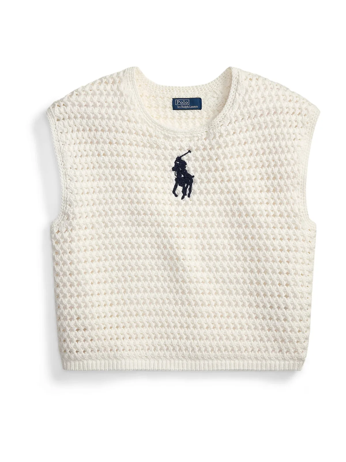 Design: Gesneden mouw, Rechte zoom; Materiaal: Gehaakt; Halstype: Ronde hals; Motief: Logoprint; Details: Borduursels; Extra's: Licht transparant, Label borduurwerk, Met textuur; Pasvorm: Normale pasvorm; Armlengte: Mouwloos; Lengte: Normale lengte