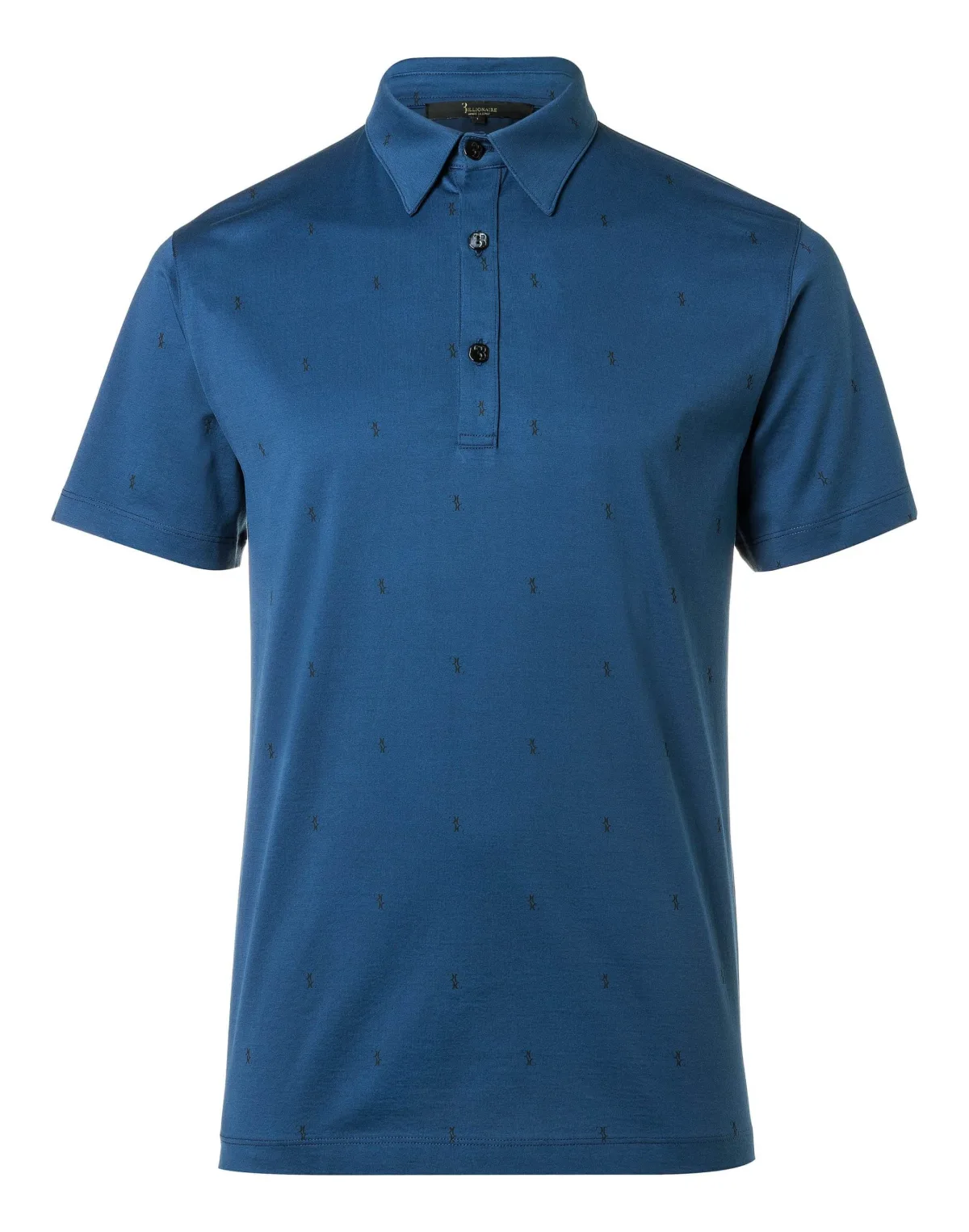 Mercerized jersey cotton polo shirt. Squared mother of pearl buttons. All over printed logo. Embroidered hang loop at the back yoke. Two side slits.