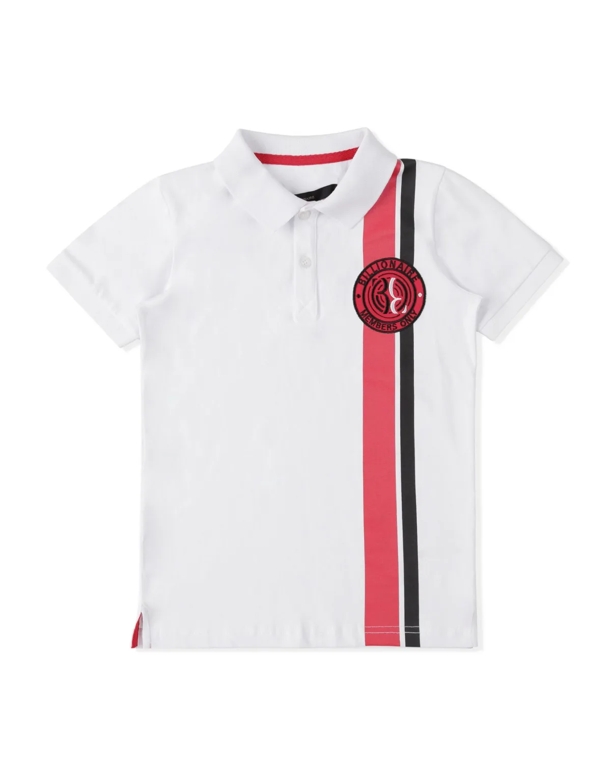 Billionaire will not give up its most significant symbol: its logo. On this cotton jersey polo shirt it is featured on a patch sewn at left chest. Contrasting vertical bands printed decorations. Buttoning at ribbed collar. Ribbed cuffs. Two side slits.