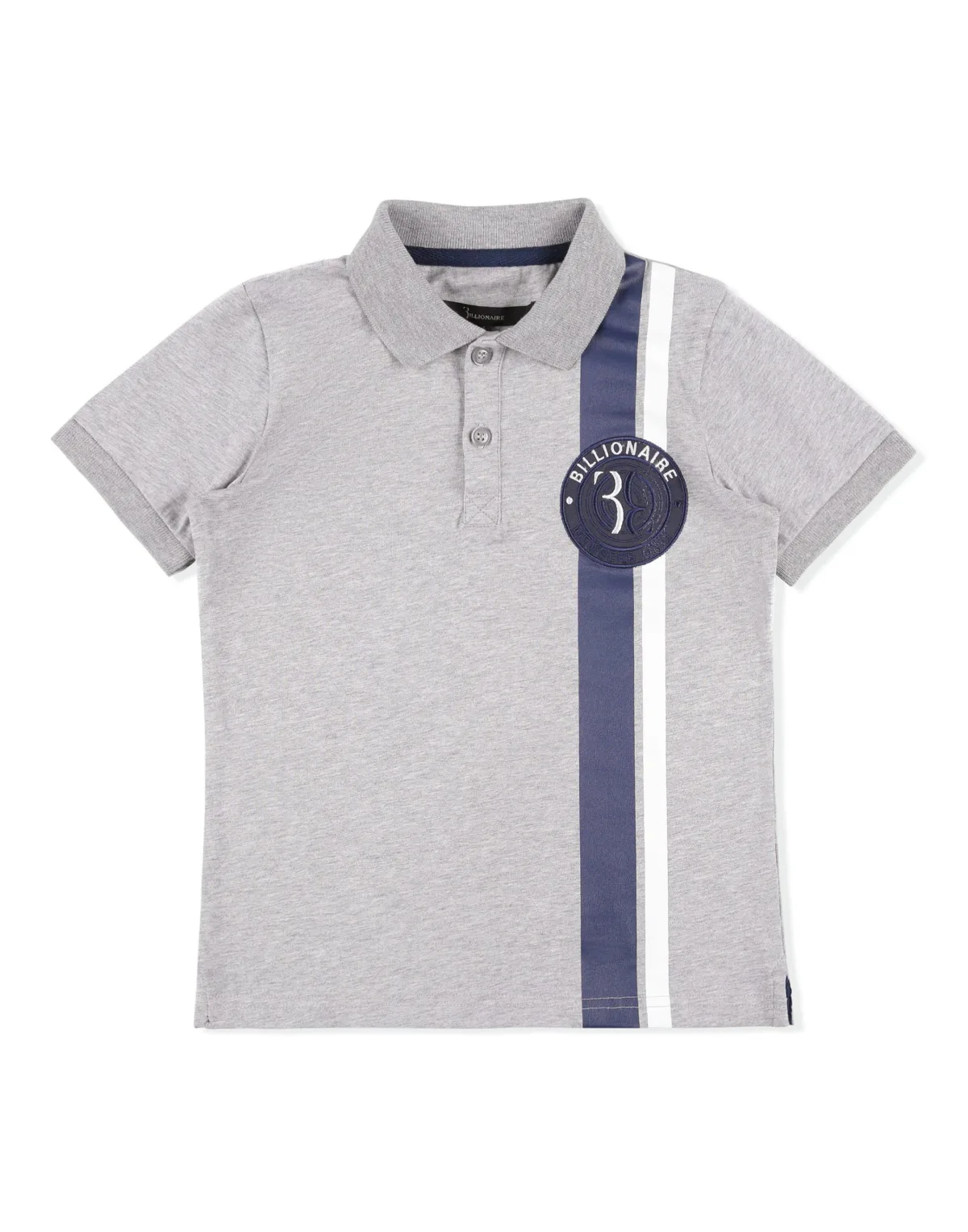 Billionaire will not give up its most significant symbol: its logo. On this cotton jersey polo shirt it is featured on a patch sewn at left chest. Contrasting vertical bands printed decorations. Buttoning at ribbed collar. Ribbed cuffs. Two side slits.