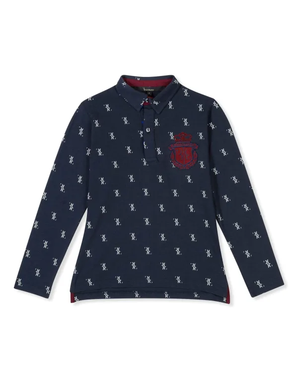 All over printed cotton jersey long sleeves polo. Crest embroidered at the left chest. Mother of pearl buttons. Two slits at the sides.