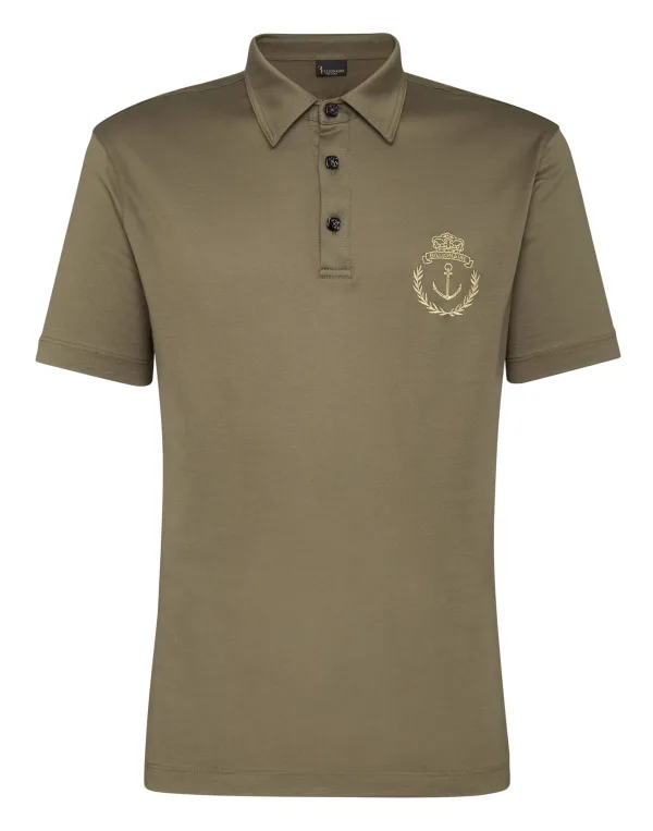 Een op de zee geïnspireerd embleem is geborduurd op de linkerborst van dit katoenen jersey poloshirt. Een kleiner embleem is geborduurd op de ophanglus bij het juk. Twee splitjes op de rug. Stiksels met twee naalden op de manchetten en onderkant.
