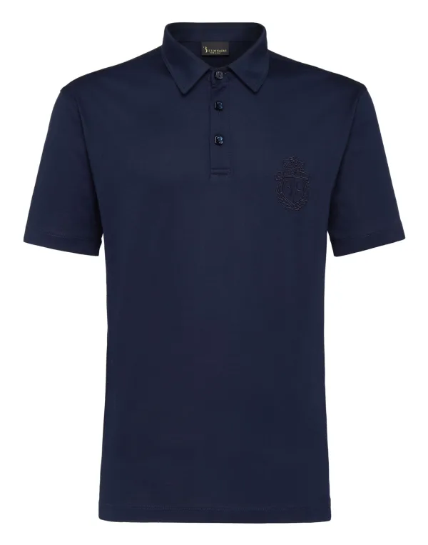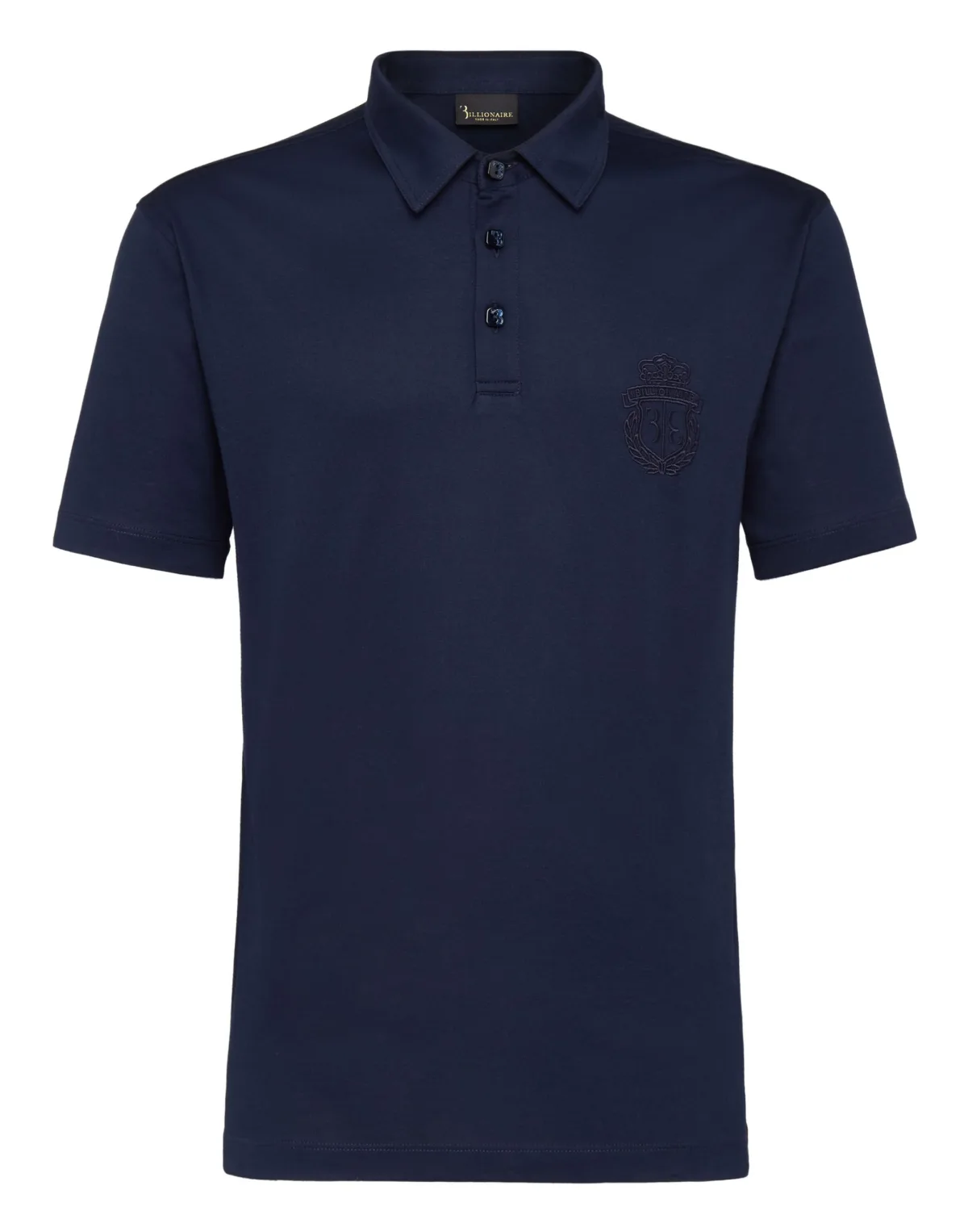 Billionaire will not give up its most important symbol: the coat of arms. On this cotton jersey polo shirt it is embroidered at left chest. Mother-of-pearl, squared buttons at collar. Two slits on the bottom. Two needle stitching hems.