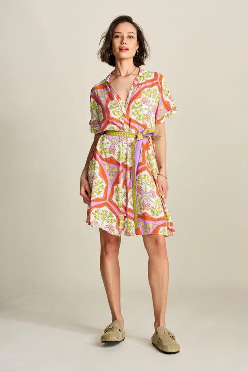 Dit kledingstuk, vervaardigd van hoogwaardige materialen, belooft zowel duurzaamheid als een luxueuze uitstraling. De speelse print en levendige kleuren geven het design een opvallend en fris karakter. Met een gemakkelijke overhemdkraag en vlotte knoopsluiting combineert deze jurk moeiteloze elegantie met praktische bruikbaarheid. De ceintuur accentueert je taille, terwijl de comfortabele pasvorm zorgt voor bewegingsvrijheid.