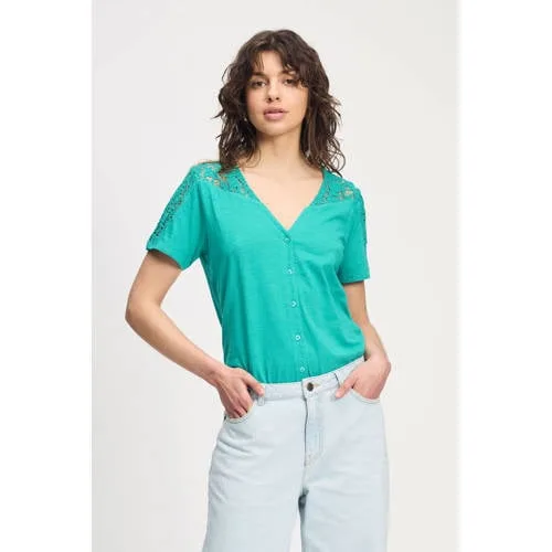Dit T-shirt van POM Amsterdam is gemaakt van 100% katoen en heeft een rechtvallende pasvorm. De korte mouwen en de V-hals geven het shirt een luchtige uitstraling. Mooi afgewerkt met kant en broderie.