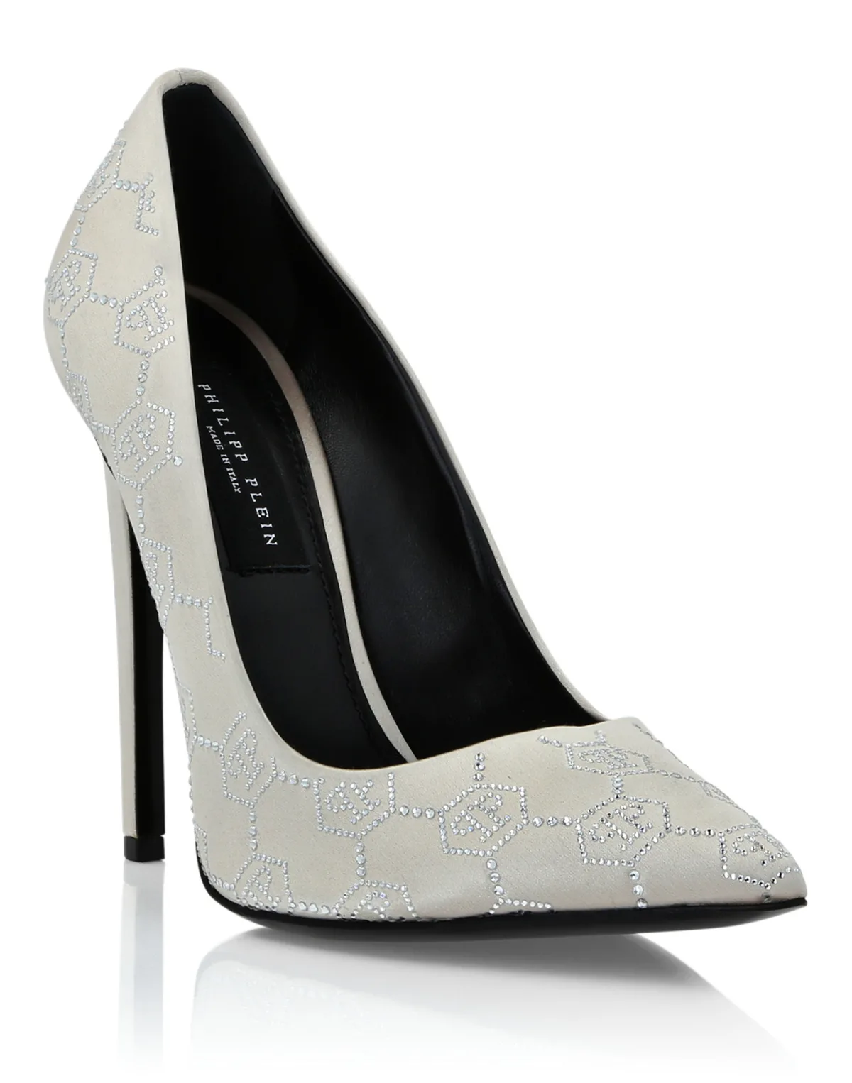 Verfraaid Show your grit and fashionable side with these satin pumps. Check out the details. Bejewelled satin upper Genuine leather sole Inner lining, leather footbed 12 cm lined heel