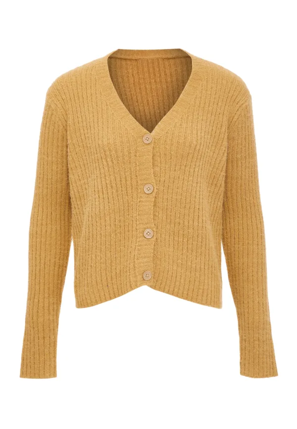 Design: Geribbelde kraag, Knop placket, Geribd ceintuurtje; Type sluiting: Knoopsluiting; Halstype: V-hals; Motief: Effen; Extra's: Fully fashioned, Voelt zacht aan; Pasvorm: Normale pasvorm; Armlengte: Lange mouw; Lengte: Normale lengte