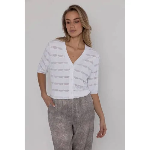 Fris, licht en makkelijk te combineren, dit witte Poools vest is een fijne basis voor het nieuwe seizoen. Het kortere model met halve mouwen en V-hals geeft elke outfit direct een verzorgde uitstraling. De streepstructuur in het breisel zorgt voor net wat extra detail, terwijl de rechte pasvorm soepel om het lichaam valt. Dit gebreid dames vest sluit met een knoopsluiting, waardoor je het zowel open als dicht stijlvol draagt.Details die je elke dag aantrekt Korte lengte, ideaal over een top, blouse of jurk Halve mouwen met rechte mouwinzet voor een rustige look V-hals en knoopsluiting aan de voorkant Zachte, soepele kwaliteit van 89% viscose en 11% polyamide Rechtvallende pasvorm, comfortabel en prettig in het dragen Zonder zakken voor een slank en rustig silhouet Wasbaar op 30 graden en lauw strijkbaarLicht vest voor laagjes tijdens de lenteDit vest is geschikt voor dagen waarop je een extra laagje wilt zonder dat het te warm wordt. Draag het over een top met korte mouw op een jeans voor een casual look, of over een jurk voor een meer verzorgde combinatie. Door de witte kleur past het makkelijk bij verschillende tinten in je garderobe.Poools: vrouwelijke stijl met aandacht voor detailPoools ontwerpt dameskleding met een vrouwelijke en eigentijdse uitstraling. De collecties worden samengesteld met aandacht voor pasvorm, draagcomfort en mooie materialen. Zo voeg je met elk Poools item een doordacht kledingstuk toe aan je kast waar je vaak naar grijpt.Een licht, gebreid vest dat je garderobe op een subtiele manier compleet maakt.