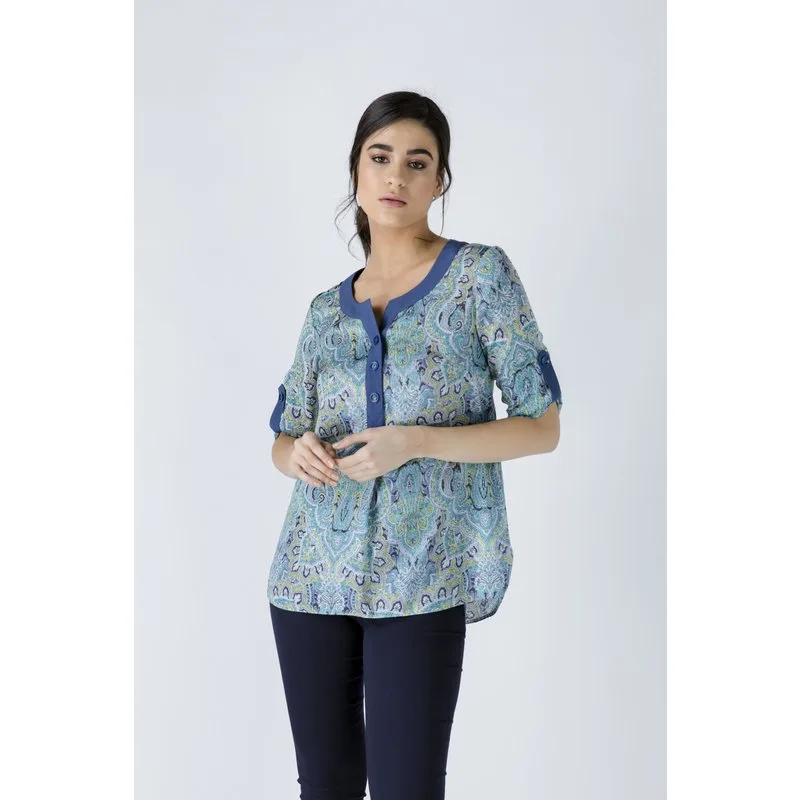 Bedrukte top van geweven popeline stof, 100% viscose. ¾ lengte mouwen. Ronde halslijn met V-opening aan de onderkant met een sluiting met 3 petrolblauwe plastic knopen. Petrolblauwe georgette bies bij de hals en sluiting. Petrolblauw georgette lipje en petrolblauwe knoop op de mouwen om op te rollen. Afgeronde ongelijke zoom die achter 6 cm langer is. Splitjes aan de zijkanten. Ons model is 172cm en draagt maat 36/S. Afmetingen voor maat 36 (in cm): Schouder -39; Borst-48; Taille-50; Onderkant-58; Mouwlengte-35; Lichaamslengte-67. 100% polyester