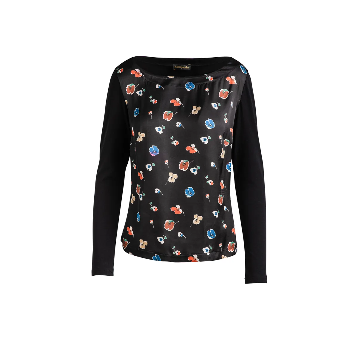Top met lange mouwen en een boothals. Geweven stof met print in 100% viscose aan de voorkant. Mouwen en rug in effen zwarte stretch jersey. Recht silhouet. Lengte voor maat 38: 58cm. Ons model is 178cm en draagt maat 36.