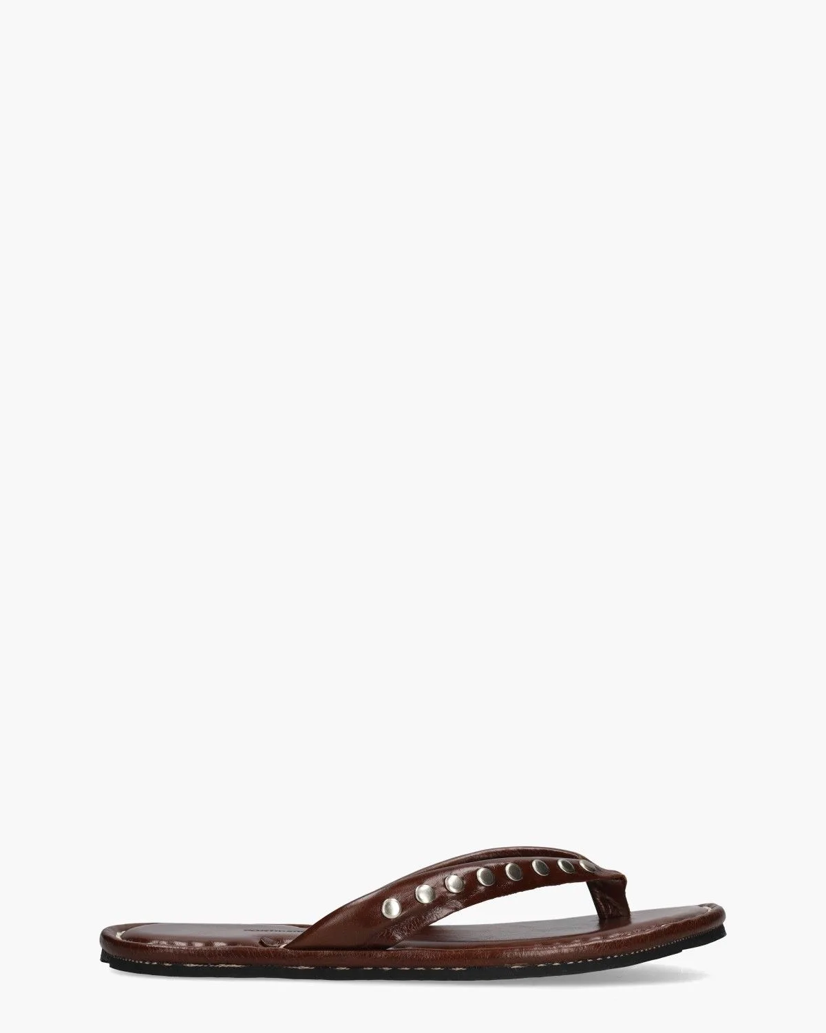 Met de Dali van Port Menorca kies je voor damesslippers die direct opvallen door hun details. Het diep donkerbruine leer geeft dit model een warme, luxe uitstraling. De leren voering draagt comfortabel, ook op warme dagen. De zilveren studs zorgen voor een stoer accent. De rubberen zool en het contrasterende stikwerk in de zoolrand