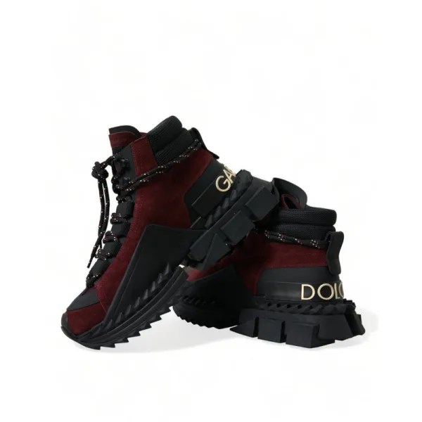 Stap naar buiten, val op en beheers de straten. Deze Dolce & Gabbana Portofino high-tops bieden ongeëvenaard stijl en comfort de hele dag door. Het premium bordeauxrood suede en de zwarte leren accenten zorgen voor een luxe gevoel, terwijl de chunky rubberen zool een gedempte stap biedt. Geniet van een veilige, verstelbare pasvorm met de klassieke vetersluiting. De robuuste constructie zorgt voor langdurig draagplezier, klaar voor elk urban avontuur. Verhoog je dagelijkse look met deze iconische sneakers, een perfecte mix van verfijning en street-style rand.