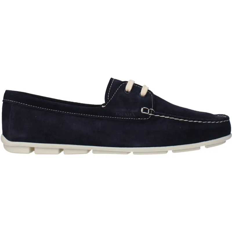 Beschrijving: Het product met MPN 1DD078054005F0008 en code F81028 van blauw suede is een loafers ontworpen door Prada. Het heeft kenmerken zoals een zijlogo.