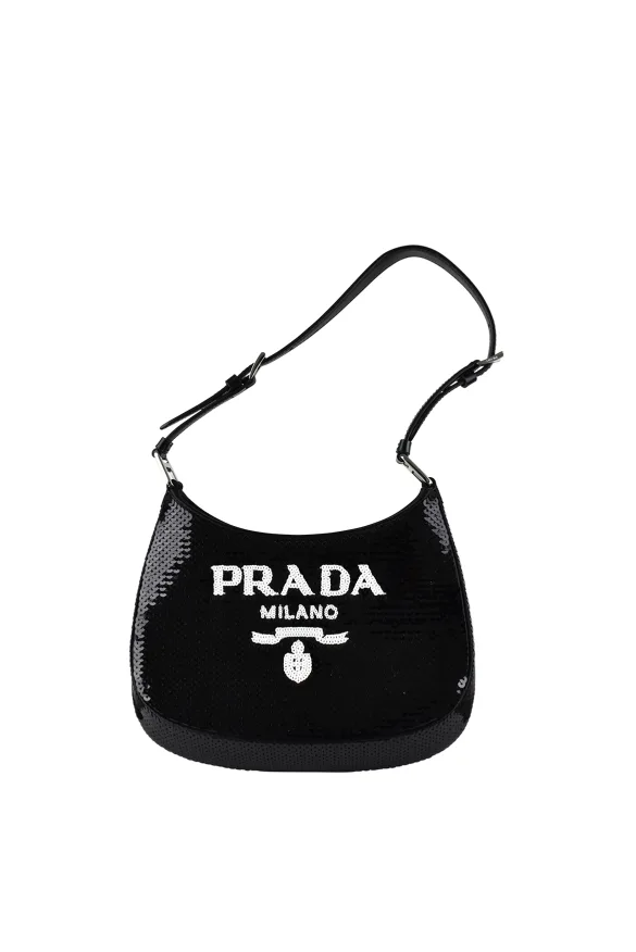 Cleo tas Prada van zwart lovertje.Wit lovertjeslogo op voorkant tas.Verstelbaar leren handvat.Zilveren metalen details.Drukknoopsluiting.Afmetingen: 15,5 x 22 x 4 cm.Made in Italy.