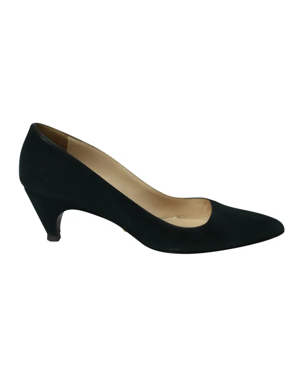 VINTAGE, RRP ALS NIEUW Een klassieke aanvulling op je schoenencollectie, deze Prada pumps zijn gemaakt van soepel suede in een tijdloze pumpshapes. Een slanke kegelhak en puntige neus geven deze hakken een tijdloze uitstraling. Prada Kegelhak Sandalen in Groene Suede Kleur: groen Materiaal: Suede Maat: 37 Conditie: goed Gebruikssporen: versleten zolen, vieze teen SKU: 127603