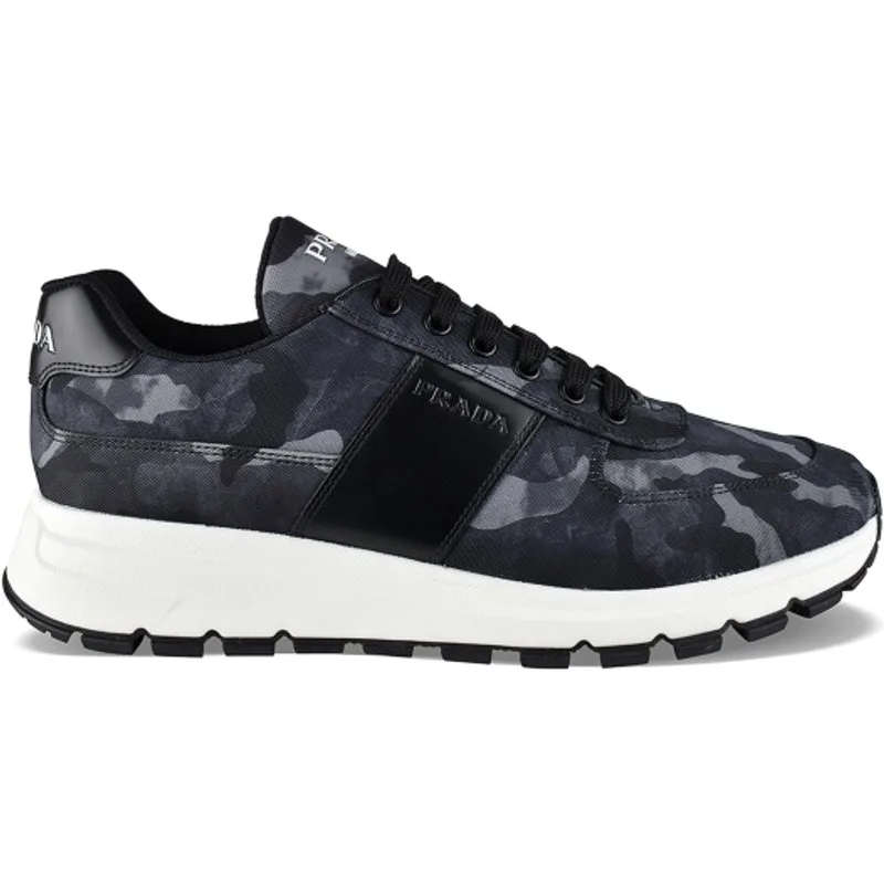 Prax sneakers Prada van grijs camouflage canvas.Lederen logostrip. Wit logo op tong.Zwarte leren contrefort met logo.Vetersluiting.Lichtgewicht geëxpandeerde rubberen zool met inkepingen.Made in Italy.