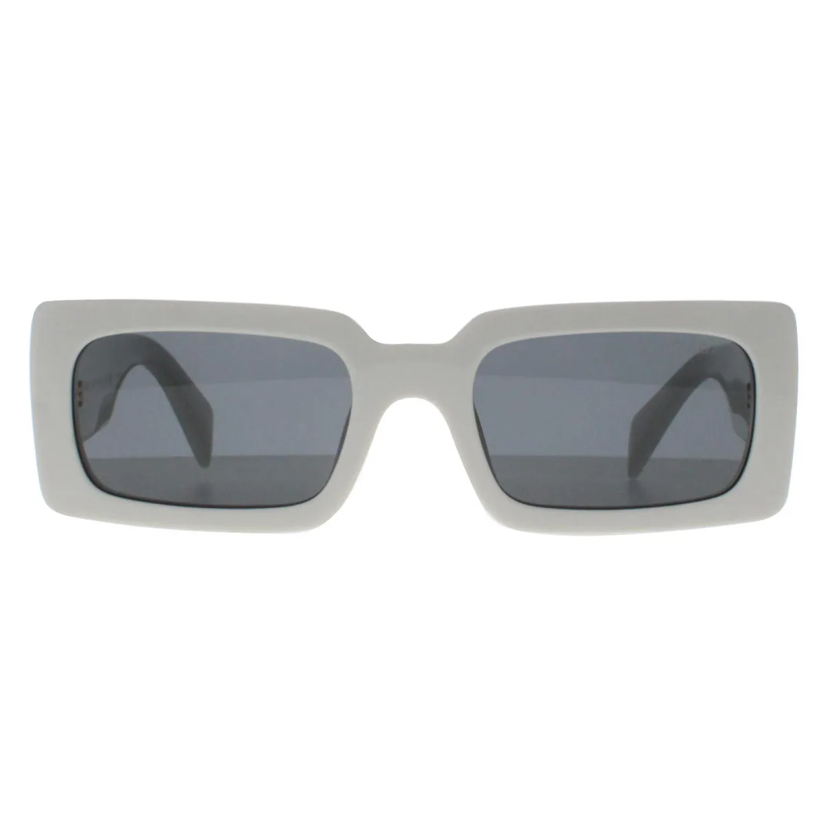 Prada Rectangle Womens Talc Dark Grey PRA07S zonnebrillen stralen eigentijdse elegantie uit door hun verfijnde rechthoekige montuur dat zorgvuldig vervaardigd is uit hoogwaardige materialen en duurzaamheid en comfort garandeert. Het iconische Prada embleem accentueert subtiel de slapen, een bewijs van exquise luxe.