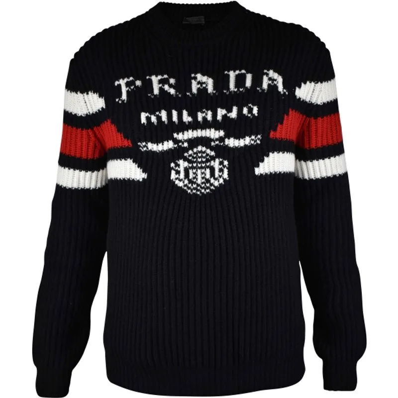 Trui Prada van zwart kasjmier.Horizontaal rood en wit logo op borst.Ronde hals. Geribde randen.Lange mouwen.100% kasjmier.