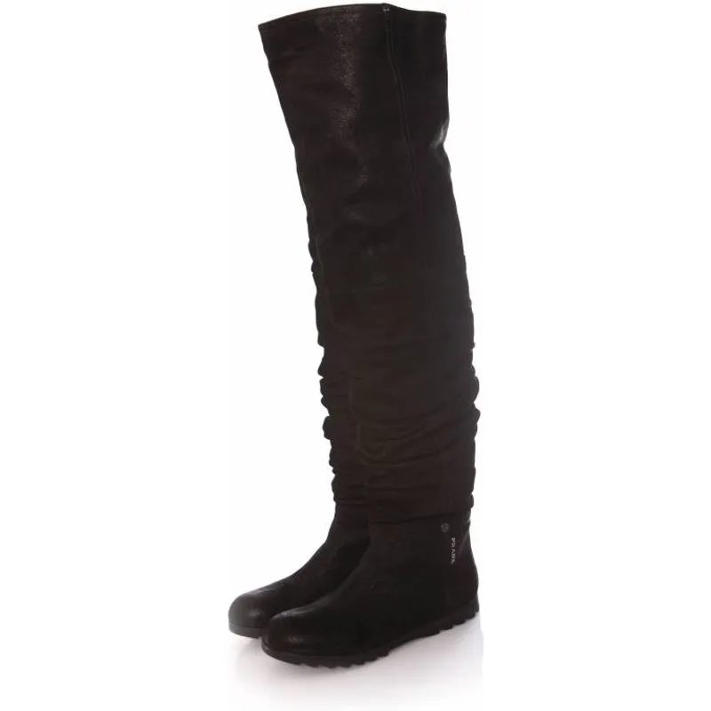 Prada, zwarte lange leren kreuklaarzen in maat 37,5. Dit product is nieuw/heeft nooit gedragen en wordt geleverd met het originele stofzakje. Afmetingen: hoogte: 610 mm