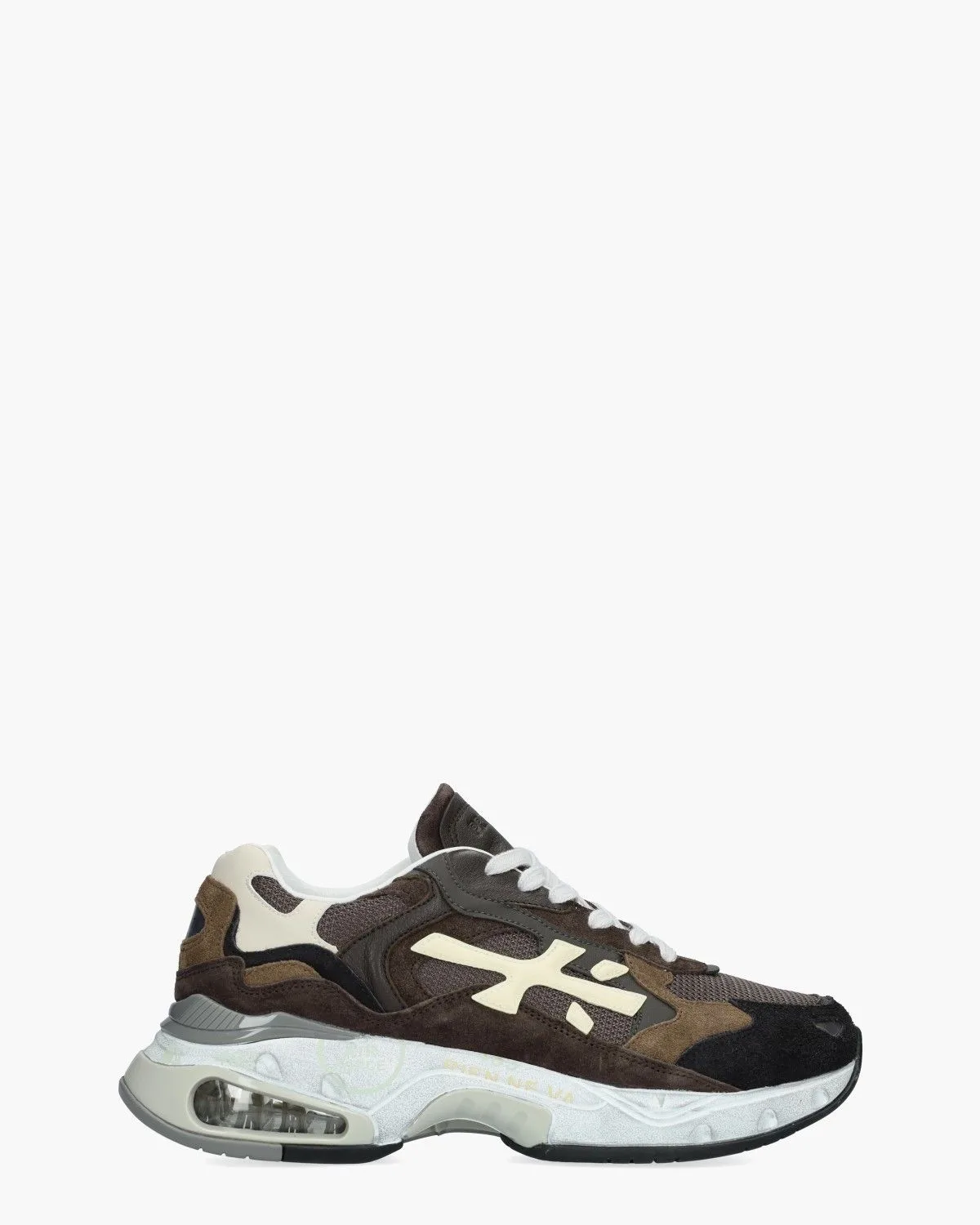 De Sharky 320 herensneakers van Premiata brengen een stoere mix van materialen en kleuren inéén krachtig ontwerp. Het donkerbruine mesh vormt de basis, aangevuld met panelen van kalfssuède en kunstleer in verschillende bruintinten, zwart en off-white. De leren en kunstleren voering en het uitneembare voetbed zorgen voor comfort, terwijl de