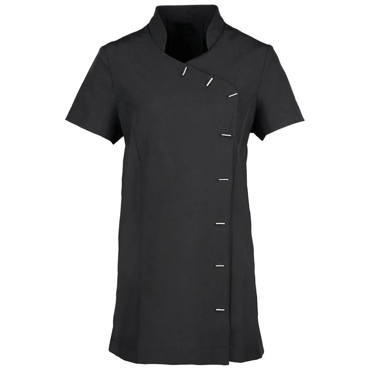 100% Polyester. Stof: Effen weefsel. Ontwerp: Eenvoudig. Sluiting: Asymmetrisch. Halslijn: Mandarijn kraag. Mouwtype: Korte mouwen. Staafvormige knopen, centrale rugplooi, prinsessennaden, zijsplitten. 185gsm. Duurzaamheid: Amfori, BSCI, Oeko-Tex Standaard 100 gecertificeerd, REACH, Sedex.