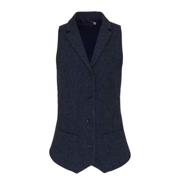Een aantrekkelijk, veelzijdig vest voor vrouwen. Gestileerd met een reverskraag die naar het hoofdgedeelte van het vest leidt met vijf knoopssluiting. Het visgraatmotief is bereikt door twee gekleurde garens aan elkaar te weven.. Dit gilet is aan de onderzijde volledig gevoerd en aan de achterzijde voorzien van een gesp, zodat de drager zich kan aanpassen.. Materialen: 50% wol, 45% polyester, 5% gemengde vezels.