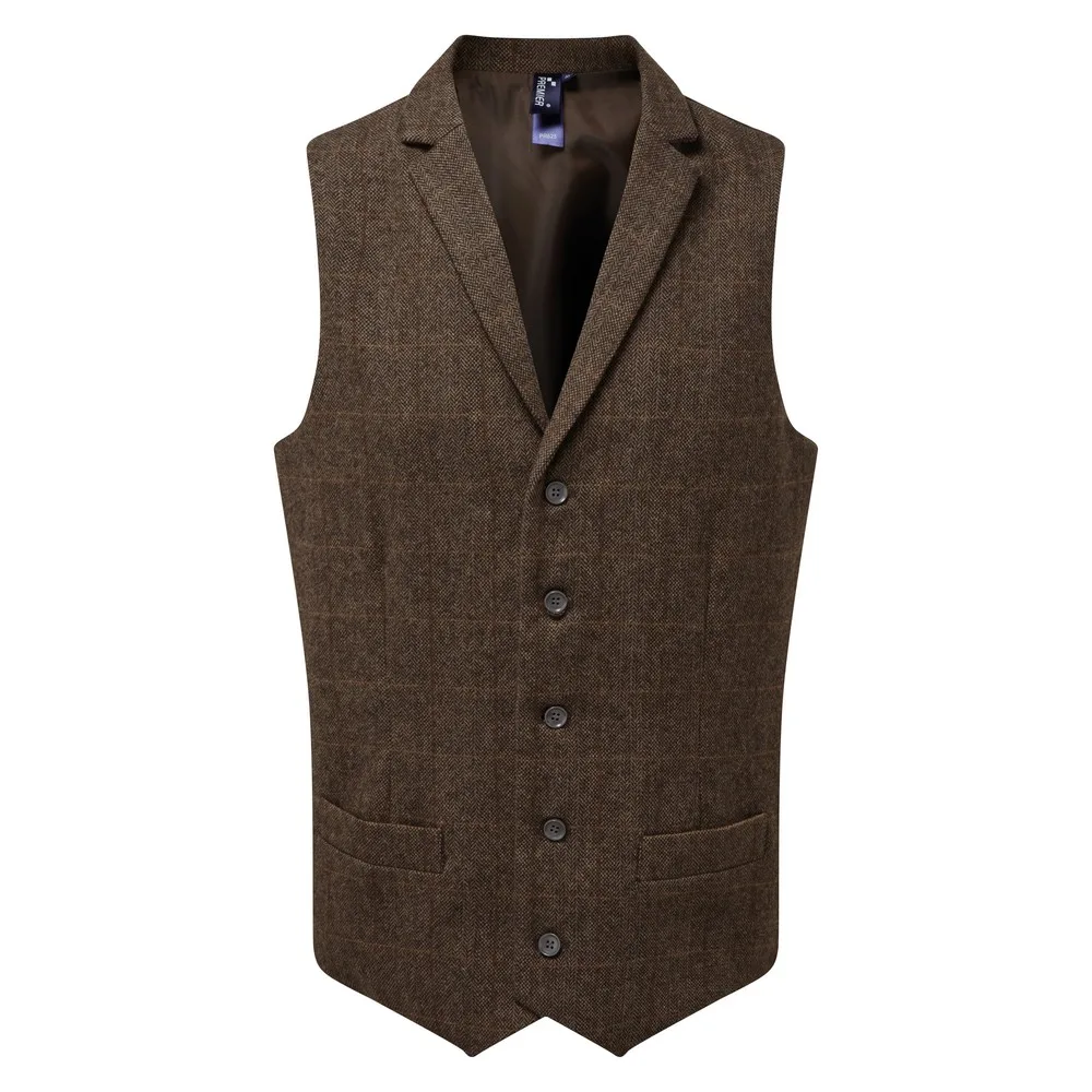 Een aantrekkelijk, veelzijdig vest voor mannen. Gestileerd met een reverskraag die naar het hoofdgedeelte van het vest leidt met vijf knoopssluiting. Het visgraatmotief is bereikt door twee gekleurde garens aan elkaar te weven.. Dit gilet is aan de onderzijde volledig gevoerd en aan de achterzijde voorzien van een gesp, zodat de drager zich kan aanpassen.. Materialen: 50% wol, 45% polyester, 5% gemengde vezels.