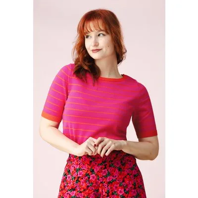 ''Pretty knitty!'' Deze gebreide cutie brengt je regelrecht naar de lente! Ze is uitgevoerd in een super comfortabele en stretchy, fijngebreide biologische katoenmix in fuchsia roze met oranje-rode streepjes — vrolijk, zacht en heerlijk om te dragen. * Ronde halslijn * Korte mouwen * Stretchy ribboorden * Lang genoeg om op een normale heupbroek te dragen