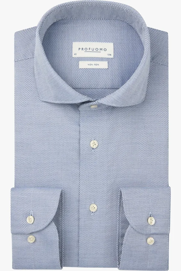 Profuomo slim fit heren overhemd basket weave middenblauw Strijkvriendelijk Boord