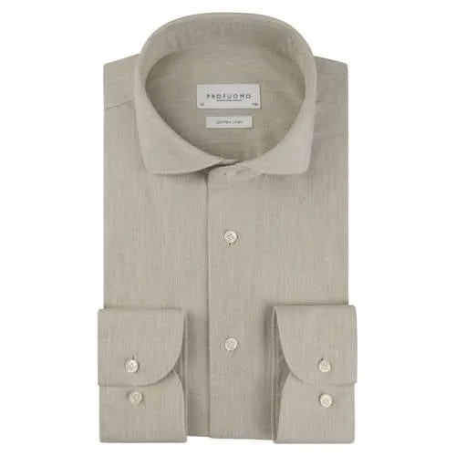 Dit beige Profuomo linnen overhemd is een moderne basis voor dagen waarop je er verzorgd uit wilt zien zonder dat het formeel aanvoelt. De combinatie van katoen en linnen zorgt voor een luchtige stof met een verfijnde structuur, ideaal voor warmer weer of lange dagen op kantoor. Dankzij de slim fit pasvorm sluit het overhemd mooi aan op het lichaam, zonder te strak te zitten.Verzorgde look met relaxte uitstraling Gemaakt van 80% katoen en 20% linnen voor een lichte, ademende stof Beige effen kleur die gemakkelijk combineert met jeans, chino's of nette broeken Slim fit pasvorm voor een moderne, aangesloten look Klassieke kraag die zowel met als zonder stropdas goed valt Lange mouwen, ideaal voor zowel zakelijke als casual gelegenheden Knoopsluiting aan de voorkant voor een klassieke afwerking Zonder borstzak voor een rustige, strakke uitstralingVan meeting tot dinerDit overhemd past bij verschillende momenten op de dag. Combineer het met een chino en nette schoenen voor een werkdag, of draag het losjes over een T-shirt met opgerolde mouwen voor een ontspannen avond. De beige kleur sluit goed aan bij neutrale tinten en past gemakkelijk in een bestaande garderobe.Profuomo: tijdloze kwaliteitProfuomo staat bekend om overhemden die stijl en comfort combineren. Met aandacht voor pasvorm, materialen en afwerking levert het merk items die lang meegaan en prettig dragen. Dit overhemd sluit naadloos aan bij die visie, met een moderne uitstraling en doordachte details.Een rustige keuze voor dagen waarop je moeiteloos verzorgd voor de dag wilt komen.