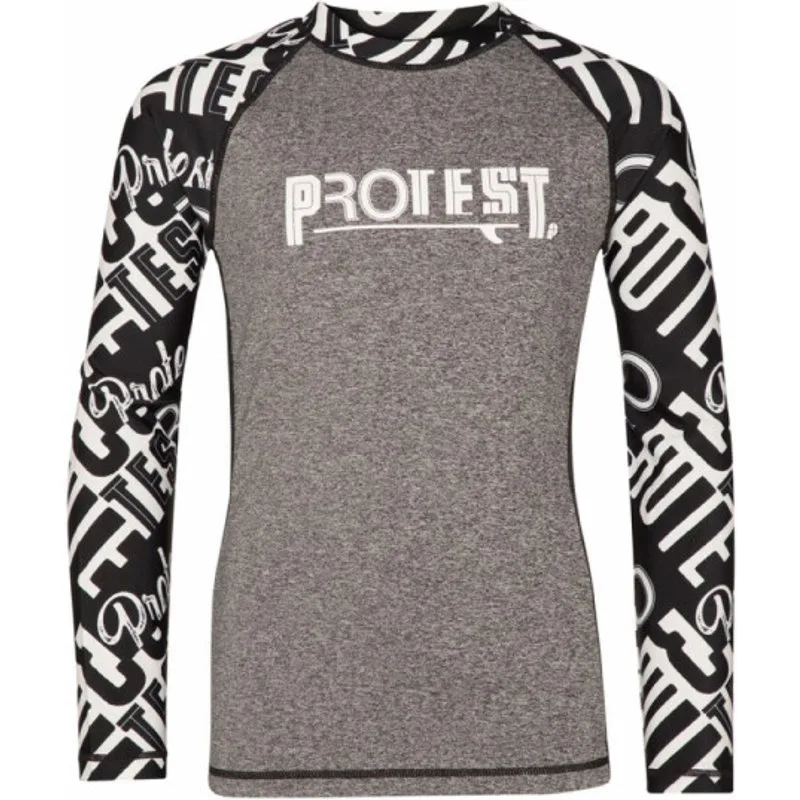 Protest RISSO JR rashguard long sleeve jongens shirt Op zoek naar een lycra? Maak kennis met de Risso JR van Protest. Deze fantastische lycra heeft een ingebouwde UV-bescherming met factor 50. Dit komt overeen met een goede zonnebrandcrème. Je huid wordt dus beschermd tegen de felle zon. Deze lycra heeft lange mouwen en een hoogsluitende hals. De mouwen zijn bedrukt met een geweldige tekstprint. De body is gemêleerd grijs en heeft een Protest-print op de borst. De stof is PFC-vrij om het gebruik van deze chemische stof te verminderen en daarmee de schade aan het milieu te beperken. De Risso JR van Protest is de perfecte lycra voor al je avonturen op het water. Handig om te weten: - Pasvorm: Normaal - Naden: Gestikt - Materiaal: Polyester