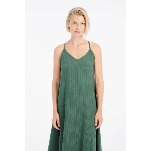 Deze jurk van Protest heeft een V-hals en spaghettibandjes. Deze is gemaakt van polyester in een olijfgroene kleur. De jurk heeft een middelgrote lengte en stijlvolle plooien. Ideaal als midi- of strandjurk.