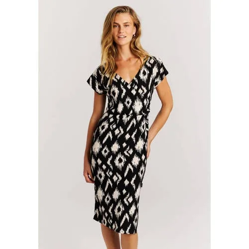 De Protest jurk PRTDelmar is een luchtige midi wikkel-look jurk die je eenvoudig aantrekt en de hele dag prettig draagt. De overslagkraag en het grafische zwart-witte dessin geven een moderne uitstraling, terwijl de elastische tailleband je figuur op een natuurlijke manier benadrukt. De soepele stof valt mooi om je heen en beweegt makkelijk met je mee, ideaal voor warme dagen en lange zomerse avonden.Details die het verschil maken Faux wikkeljurk: de overslag aan de voorkant geeft het effect van een wikkeljurk, zonder gedoe met striklinten. Elastische tailleband: sluit zacht aan in de taille voor een vrouwelijk silhouet en extra draagcomfort. Korte, rechte mouwen: bieden luchtigheid en bewegingsvrijheid, perfect bij hogere temperaturen. Midi lengte: valt tot over de knie voor een ontspannen maar verzorgde look. Gemaakt van polyester: voelt licht aan, kreukt minder snel en is makkelijk te onderhouden. Zwart-witte grafische print: eenvoudig te combineren met sandalen, sneakers of slippers. Zonder zakken en zonder sluiting: je schiet de jurk in één beweging aan.Van strand tot zomerse avondDeze midi jurk past net zo goed bij een dag in de stad als bij een etentje op vakantie. Met sandalen en een zonnehoed heb je een relaxte daglook, met een lichte cardigan en sieraden maak je er zo een avondoutfit van.Protest: stijlvol en functioneelProtest staat bekend om kleding die is geïnspireerd op het buitenleven, met aandacht voor comfort en een moderne look. De collecties zijn ontworpen om je vrij te laten bewegen, of je nu richting strand gaat of de stad in. Je kiest voor een merk dat mode combineert met praktische details.Een veelzijdige midi jurk die je garderobe klaarmaakt voor zonnige dagen en zwoele avonden.