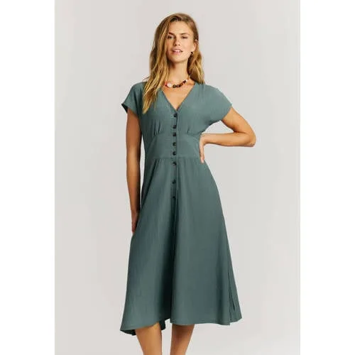 De Protest PRTNieve midi-jurk combineert een rustige stijl met praktisch draaggemak voor elke dag. Deze zomerse jurk valt tot op de kuit, heeft half lange mouwen en een V-hals met knoopsluiting aan de voorkant. Door de elastische tailleband ontstaat een subtiele vorm rond het middel, terwijl de soepele stof van polyester met elastaan zacht meebeweegt bij elke stap.Verfijnde details voor elke dag Midi-lengte tot op de kuit voor een luchtige en toch bedekte look Half lange mouwen die voldoende bedekking geven bij wisselend weer V-hals met knoopsluiting aan de voorkant voor een open halslijn Elastische tailleband die het silhouet accentueert zonder strak te zitten Effen kleur met subtiele textuur voor een rustige uitstraling Gemaakt van een zachte stof van polyester met elastaan die licht en flexibel aanvoelt Geen zakken voor een gladde afwerking langs de zijkantenEen midi-jurk voor zonnige momentenDeze midi zomerjurk is geschikt voor warme dagen waarop je een complete outfit wilt zonder veel te combineren. De lengte en half lange mouwen maken de jurk passend voor zowel werk als vrije tijd. Door de elastische tailleband hoef je niets aan te passen, je schiet de jurk eenvoudig aan en bent direct klaar om te gaan.Protest: moderne stijl met een relaxte insteekProtest ontwerpt kleding die comfort en stijl combineert en past bij een actieve levensstijl. De nadruk ligt op pasvorm en materialen die berekend zijn op dagelijks gebruik, zodat je kledingkast gevuld is met draagbare items voor uiteenlopende momenten.Een rustige, veelzijdige jurk die het hele zomerseizoen eenvoudig in verschillende outfits is te combineren.
