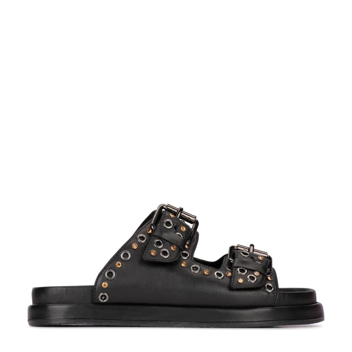 Design: Anatomisch gevormd voetbed, Profielzolen; Type sluiting: Slip; Materiaal: Leer; Plateau: Met plateau; Materiaal: Glad leer; Schoenneus: Open toe; Extra's: Studs, Flexibele zool, Metalen oogjes; Hakhoogte: Platte hak (0-3 cm)