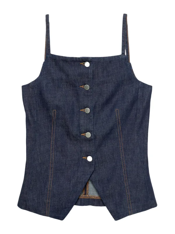 Design: Knop placket, Deelnaden, Uitgesneden rug; Type sluiting: Knoopsluiting; Voering: Niet gevoerd; Materiaal: Denim; Motief: Effen; Extra's: Contrasterende naden, Vaste grip; Pasvorm: Slanke pasvorm; Lengte: Normale lengte