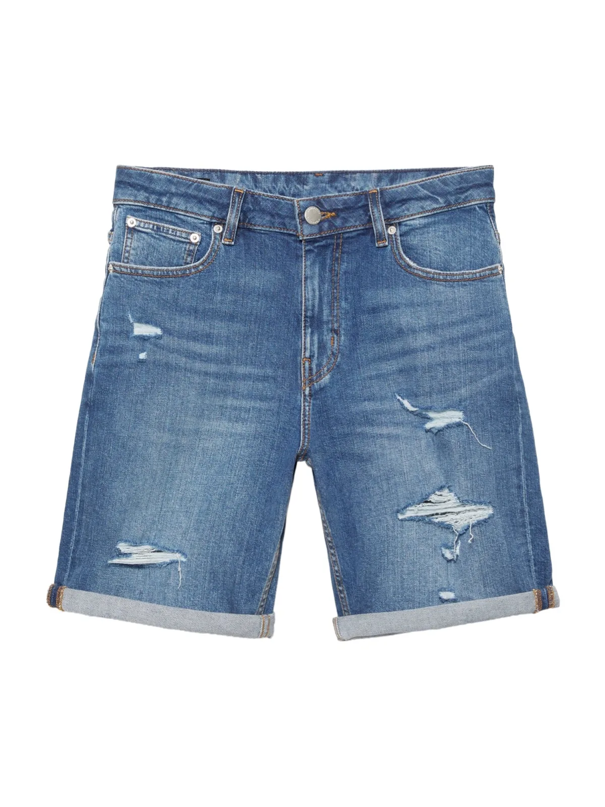 Design: Omgeslagen zoom, 5-pocket-style; Type sluiting: Ritssluiting; Materiaal: Denim; Motief: Effen; Extra's: Label patch/label flag, Used-look; Wassing: ripped; Lengte: Knielengte; Pasvorm: Normale pasvorm; Pasvorm: Slimfit