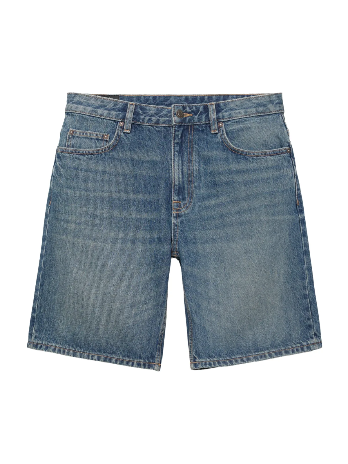 Design: Gevoerde zoom/rand, Ritssluiting, 5-pocket-style; Type sluiting: Ritssluiting; Materiaal: Denim; Motief: Effen; Extra's: Studs, Contrasterende naden, Vaste grip, Riemlussen; Wassing: Heavy washed; Lengte: Knielengte; Pasvorm: Losse pasvorm; Pasvorm: Loosefit