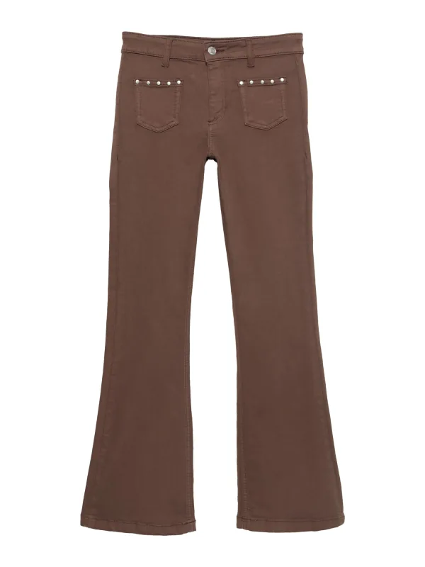 Design: Gevoerde zoom/rand, Opgezette zakken; Type sluiting: Ritssluiting; Materiaal: Denim; Motief: Effen; Extra's: Studs, Op staal naden, Riemlussen; Wassing: Colored denim; Lengte: Lang/maxi; Pasvorm: Flared; Taillehoogte: Low waist
