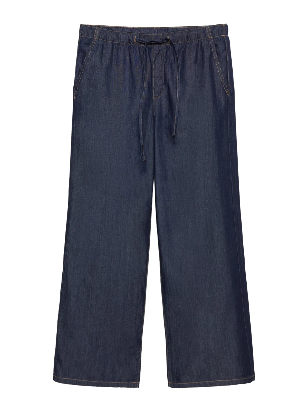 Design: Taille met trekkoord, Elastische taille/zoom, Zakken aan de zijkant; Type sluiting: Elastische band; Materiaal: Denim; Motief: Effen; Details: Gedrapeerd; Extra's: Contrasterende naden, Vaste grip; Wassing: Rinsed/dark washed; Lengte: Lang/maxi; Pasvorm: Wide leg; Taillehoogte: Low waist
