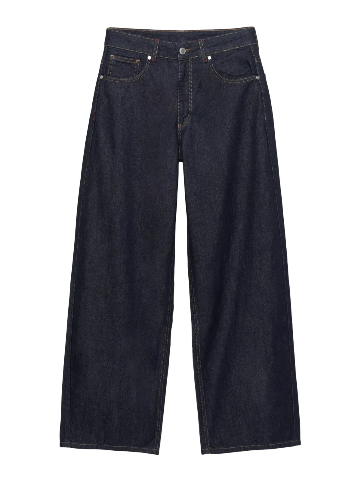 Design: Ritssluiting, 5-pocket-style; Type sluiting: Knoopsluiting; Materiaal: Denim; Motief: Effen; Extra's: Studs, Contrasterende naden, Riemlussen; Wassing: Rinsed/dark washed; Lengte: Lang/maxi; Pasvorm: Wide leg; Taillehoogte: Mid waist