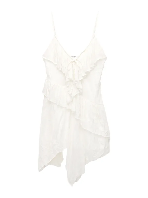 Design: Asymmetrische zoom, Om te knopen/binden; Materiaal: Katoen; Halstype: V-hals; Motief: Effen; Soort bandjes: Spaghettibandjes; Details: Volant, Gedrapeerd; Extra's: Licht transparant, Op staal naden, Voelt zacht aan; Lengte: Kort/mini; Pasvorm: Normale pasvorm; Armlengte: Mouwloos