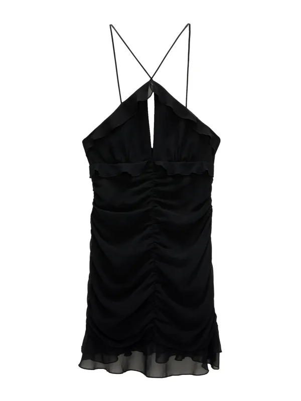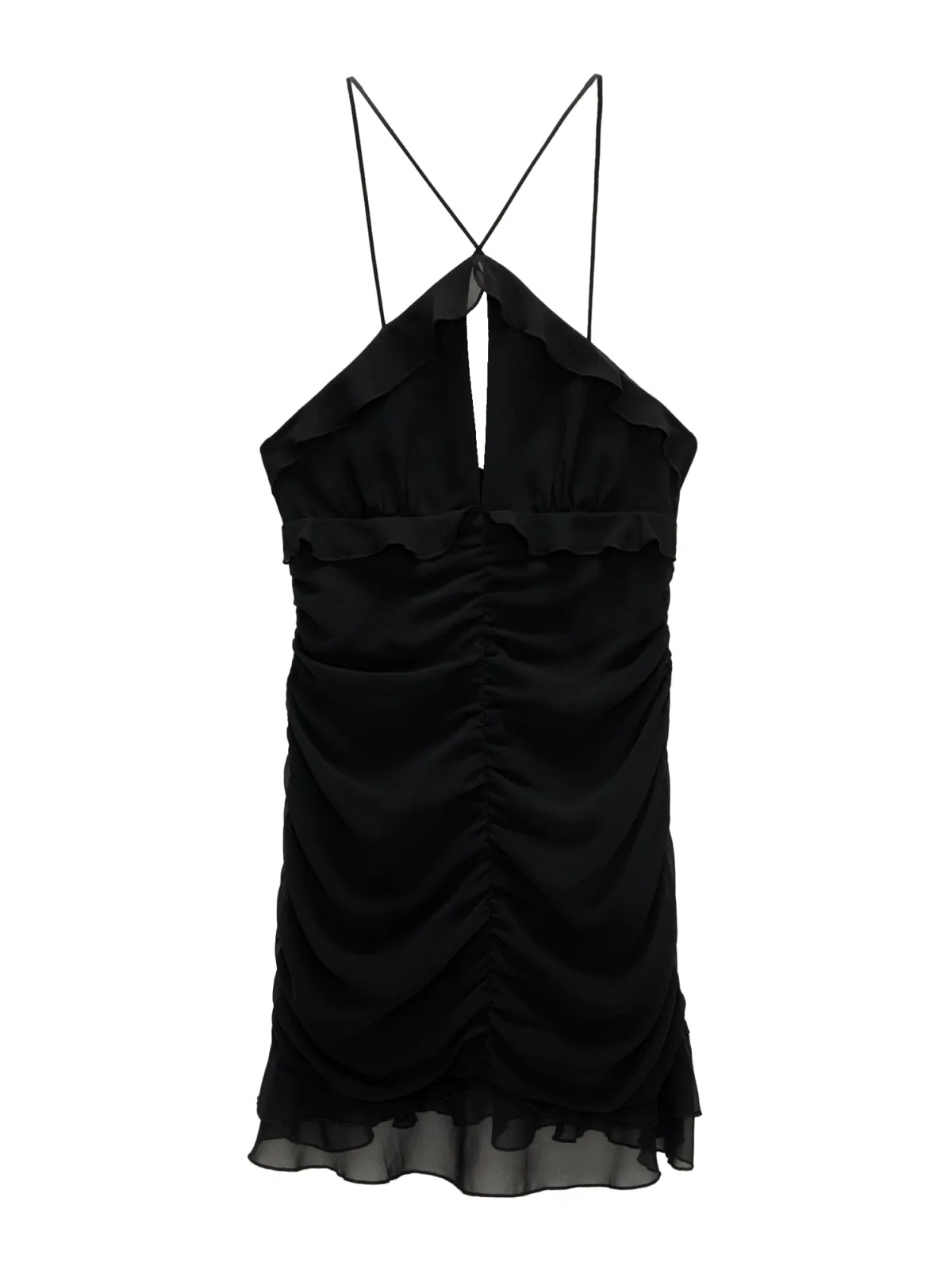 Design: Amerikaanse schouder, Om te knopen/binden; Halstype: V-hals; Motief: Effen; Soort bandjes: Haltermodel; Details: Volant, Gedrapeerd; Extra's: Op staal naden, Gladde stof; Lengte: Kort/mini; Snit: Figuur omarmend; Pasvorm: Aansluitende pasvorm; Armlengte: Mouwloos